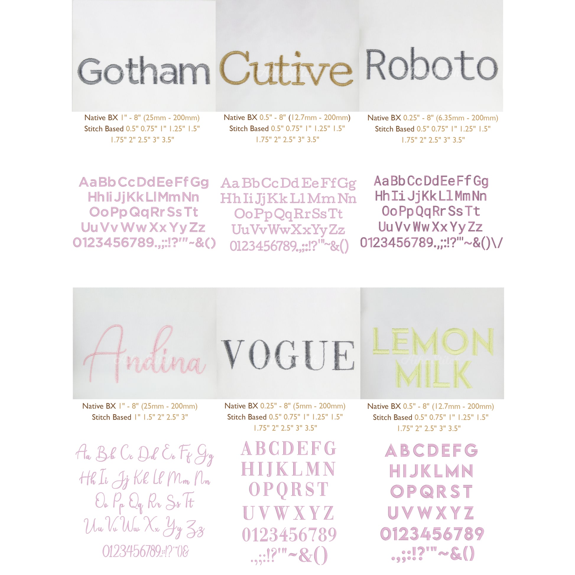 Bundle 12 Modern Sans Native BX Embroidery Fonts - Satin Stitch Alphabet (0.25-8in)