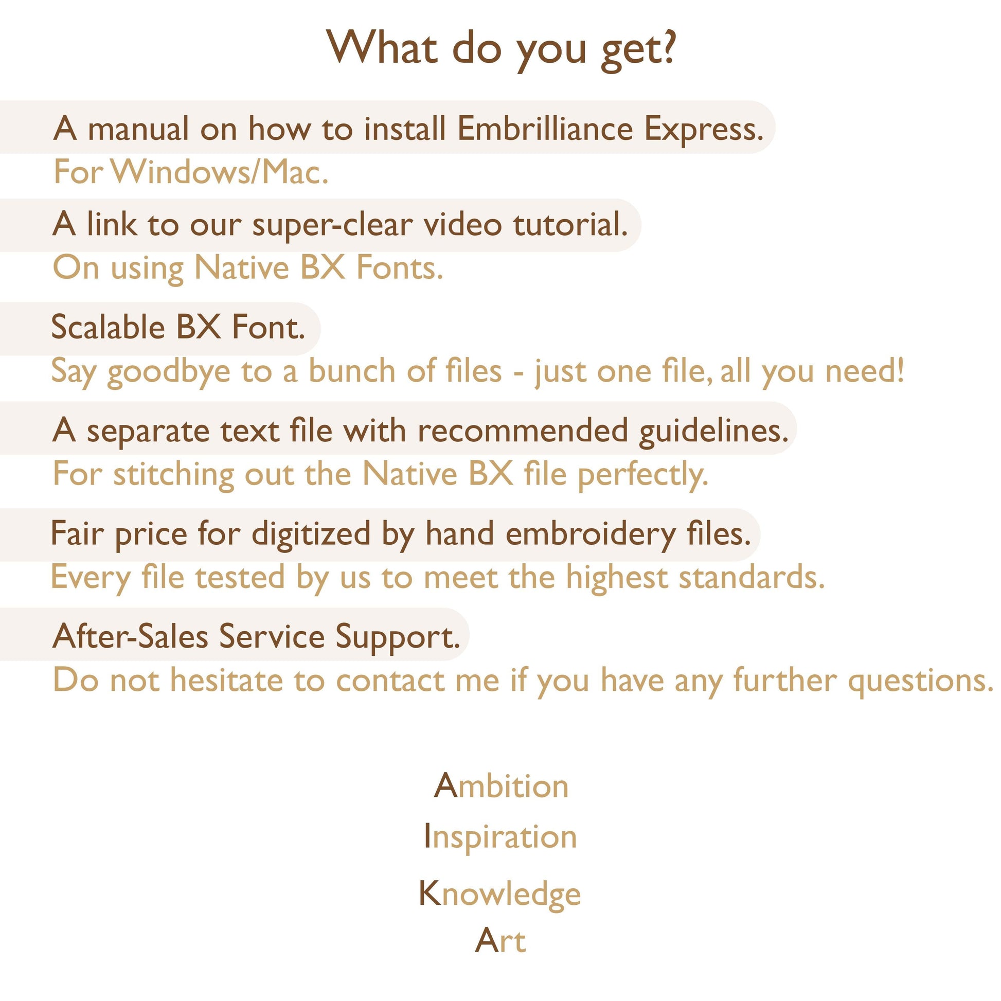 ✔️ File Formats: Native BX (for Embrilliance), / PES, DST, EXP, JEF, VP3, HUS, XXX, BX (for Embrilliance)
